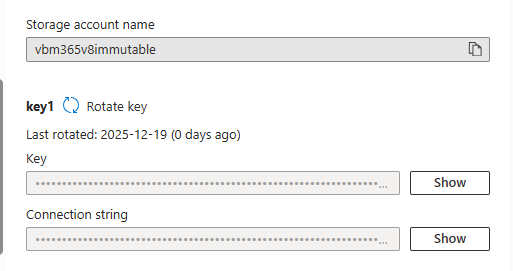 41. On the Access keys page, under key1, select Show Key and copy the storage account name and key of key1. We need them for Veeam storage repository settings later.