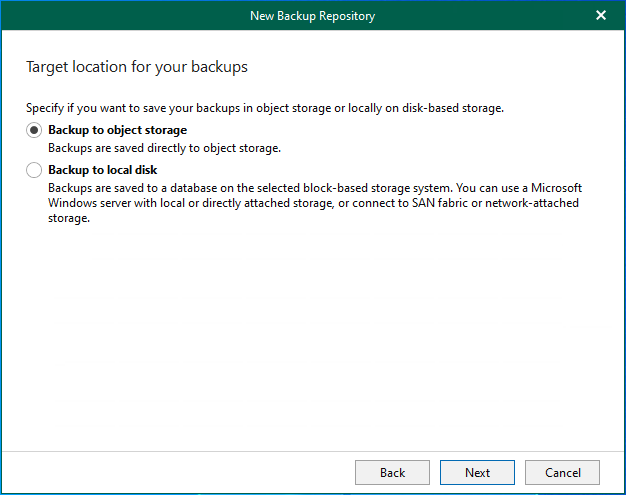 53. Select Backup to object storage on the Target location for your backups page and click Next.
