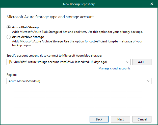 59. On the Microsoft Azure Storage Account page, select Azure Global (Standard) in the Region field and click Next.