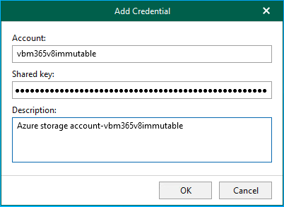 57. Type the Azure storage account name in the Account field and paste key1 in the Shared key field (you copied them when you created the Azure storage account).