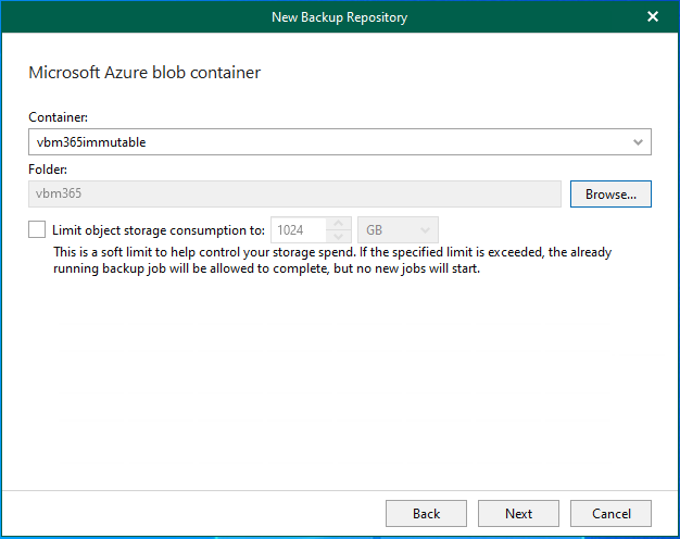 63. If you want to control the storage spend, select Limit object storage consumption, enter the storage size and click Next.