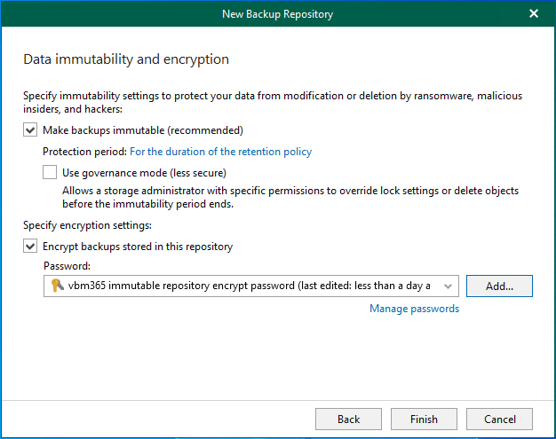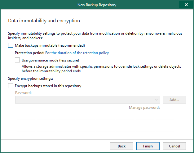 73. On the Data immutability and encryption page, select Make Backups immutable (recommended).