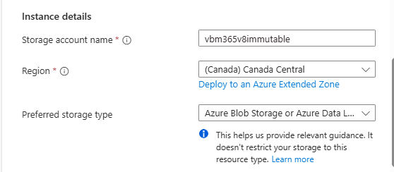 9. Select Azure Blob Storage or Azure Data Lake Storage Gen 2 as the Preferred storage type.