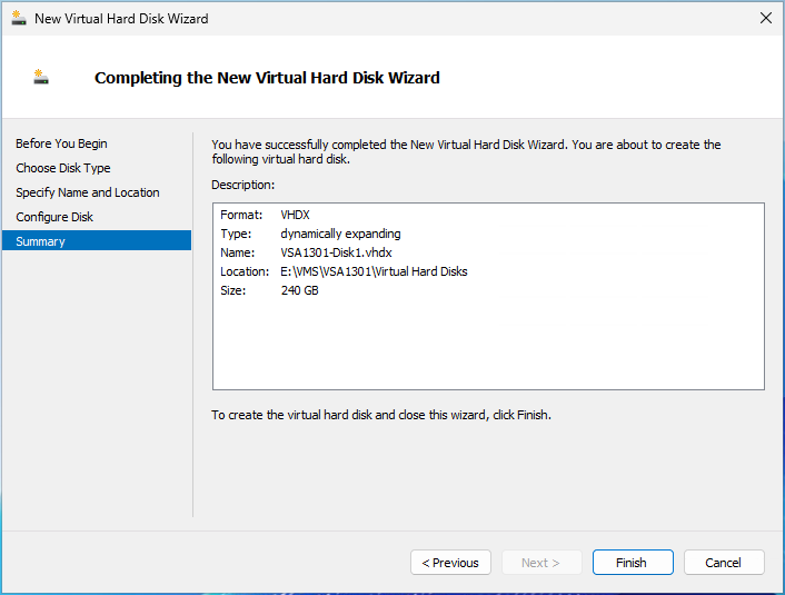 28.Click Finish on the Completing the New Virtual Hard Disk Wizard page.