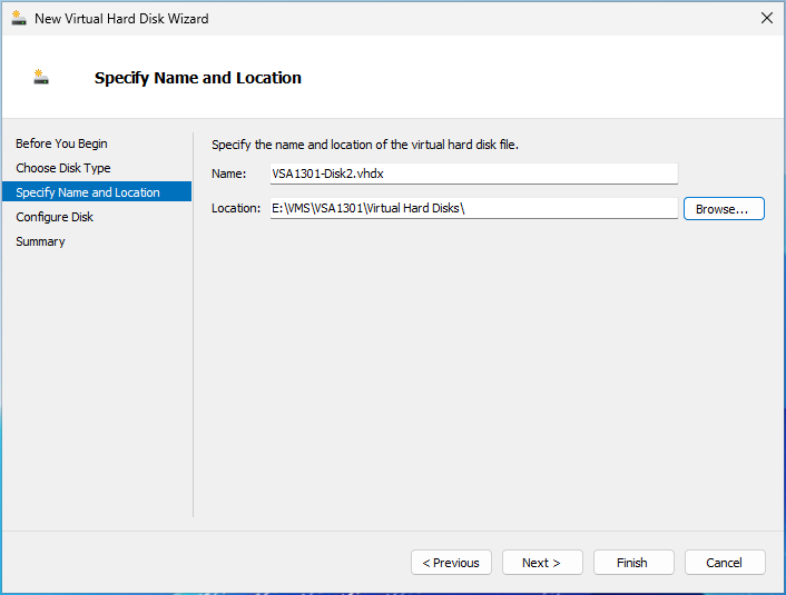 26.On the Specify Name and Location page, enter the disk2 name in the Name field, enter the path in the Location field and click Next.
