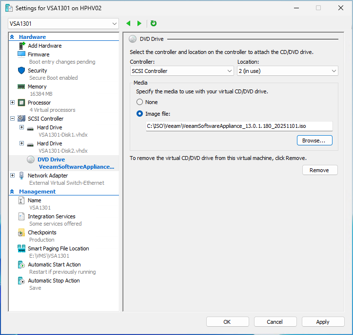 31.Select Image file (.iso), click Browse to select the Veeam Software Appliance ISO image file and click Apply.