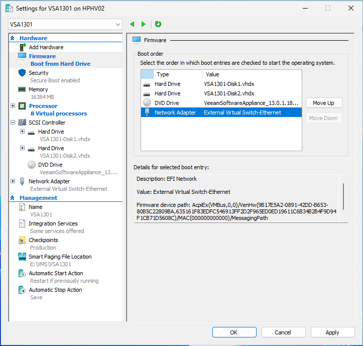 In order to install the Veeam Software Appliance (VSA) on Hyper-V 2025, you must first build a special Windows Server 2025 Hyper-V virtual machine (VM) that satisfies hardware requirements. Then, you must boot the VM from the VSA ISO.