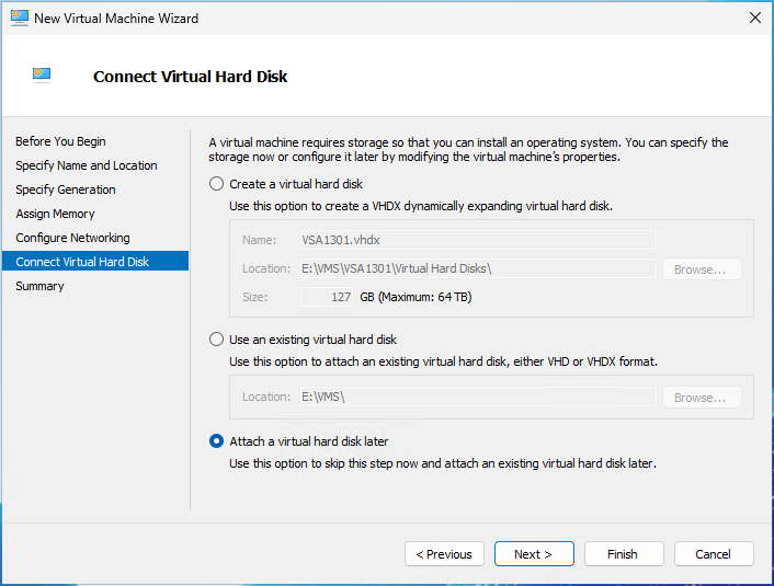 11.Select Attach a virtual hard disk later on the Connect Virtual Hard Disk page and click Next.